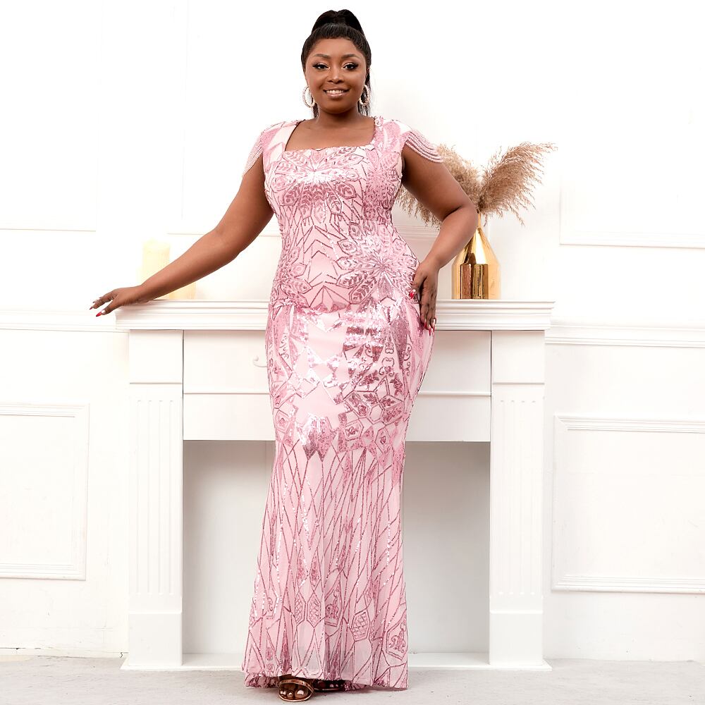 プラス サイズ スクエア ネック ピンク スパンコール イブニング ドレス セクシー な パーティー マキシ ドレス女性ビーズ ドレス ロング ウエディング ドレス 大きめサイズ スクウェア | transfom