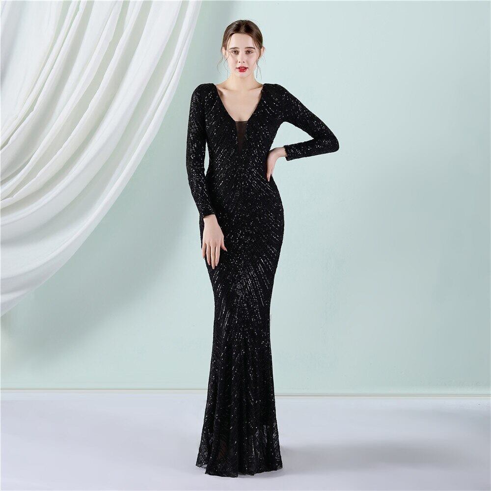 YIDINGZS ストレッチ スパンコール マキシ ドレス フルスリーブ V ネック マーメイド ストライプ イブニング ナイト ロング パーティー ドレス ゴールド ブラック Vネック | transfom