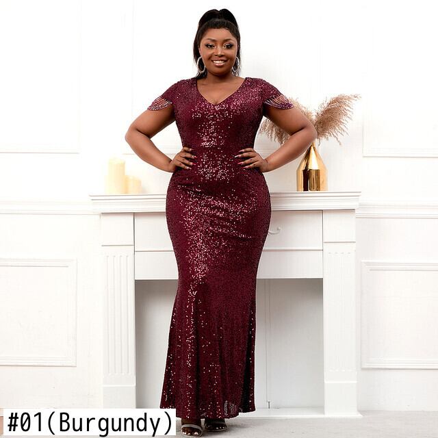 プラス サイズ V ネック ブルゴーニュ スパンコール イブニング ドレス セクシー な パーティー マキシ ドレス女性ビーズ ドレス ロング ウエディング ドレス 02 大きめサイズ Vネック | transfom