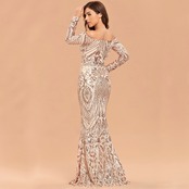 YIDINGZS ロングスリーブドレス ゴールドスパンコール イブニングドレス オフショルダー パーティー マキシドレス 長袖