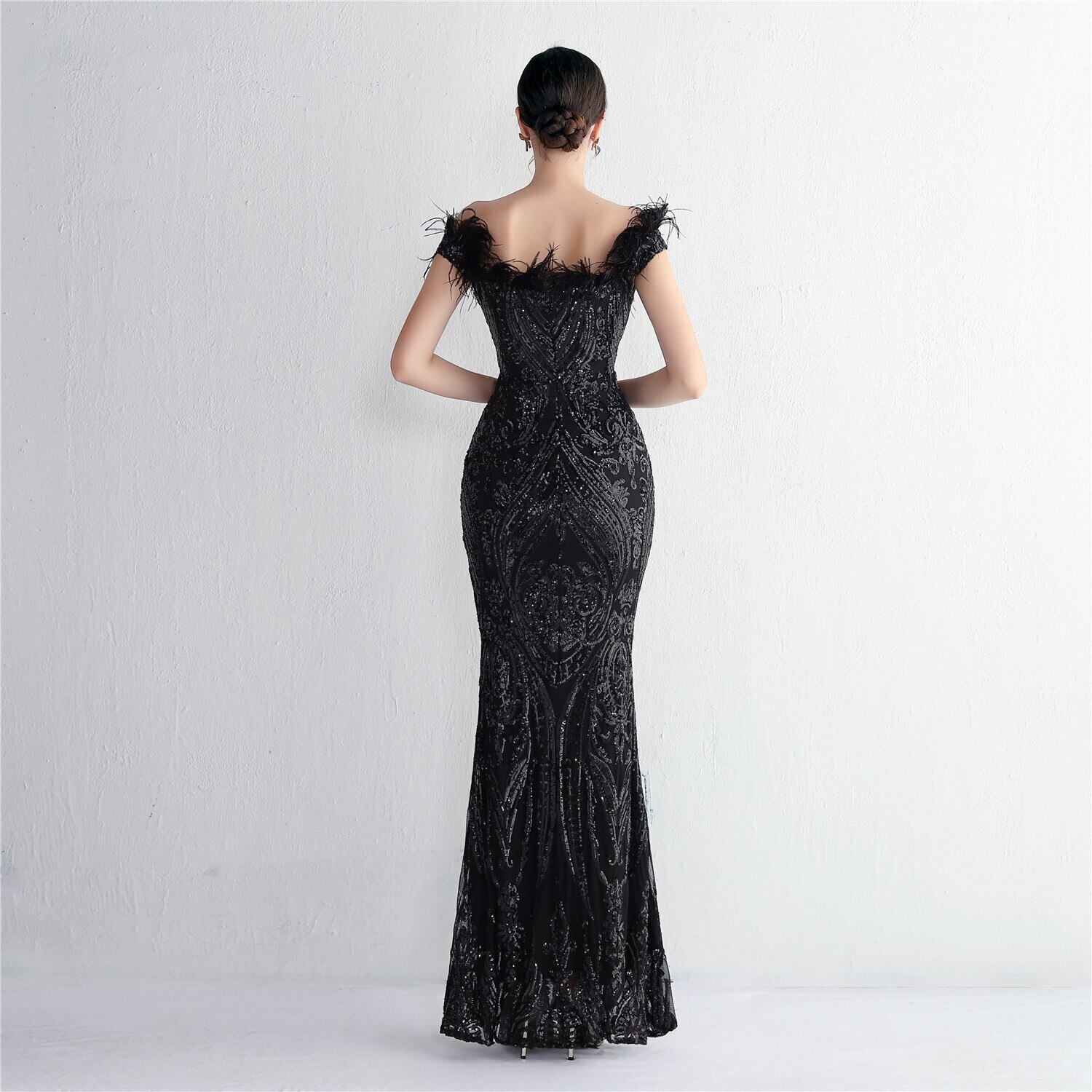 YIDINGZS 女性の羽ロングウエディングドレスオフショルダーブラックスパンコールイブニングドレスセクシーなパーティーマキシドレス 19511