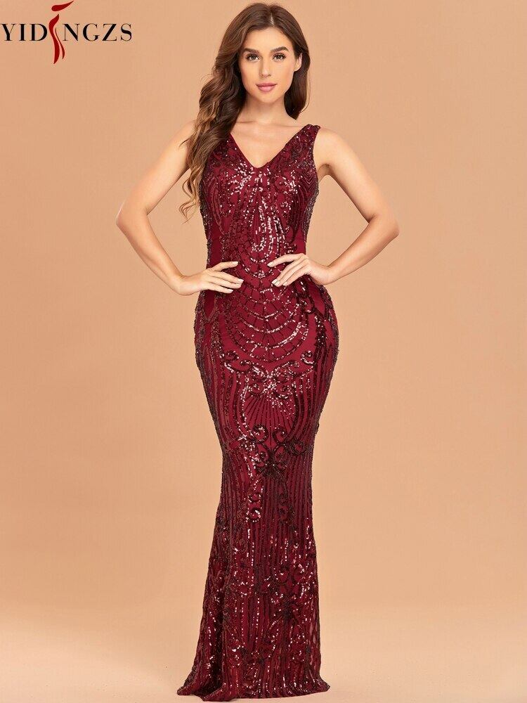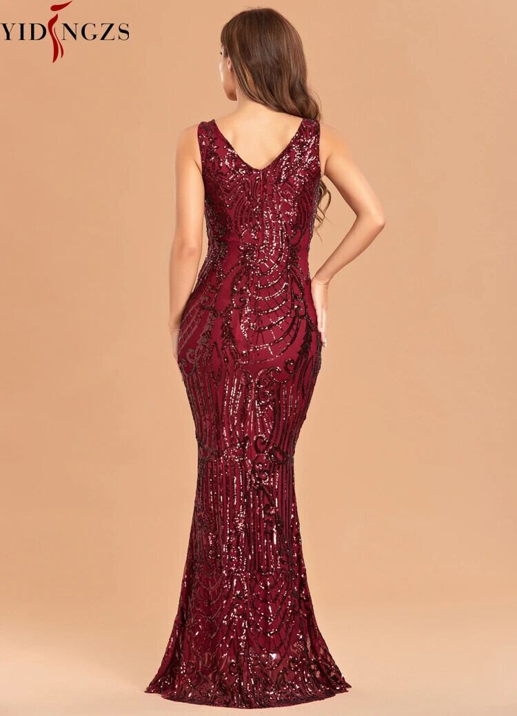 YIDINGZS V ネック ノースリーブ パーティー ドレスの女性のイブニング ドレス シンプルなブラック ゴールド スパンコール ドレス Vネック