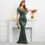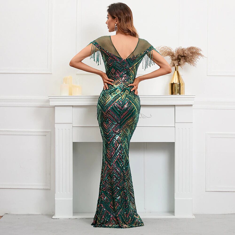 YIDINGZS イリュージョンメッシュゴールドスパンコールイブニングドレスセクシーなパーティーマキシドレス女性ビーズドレスロングウエディングドレス 18888