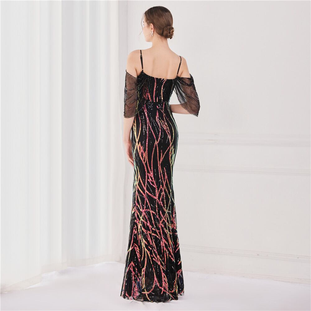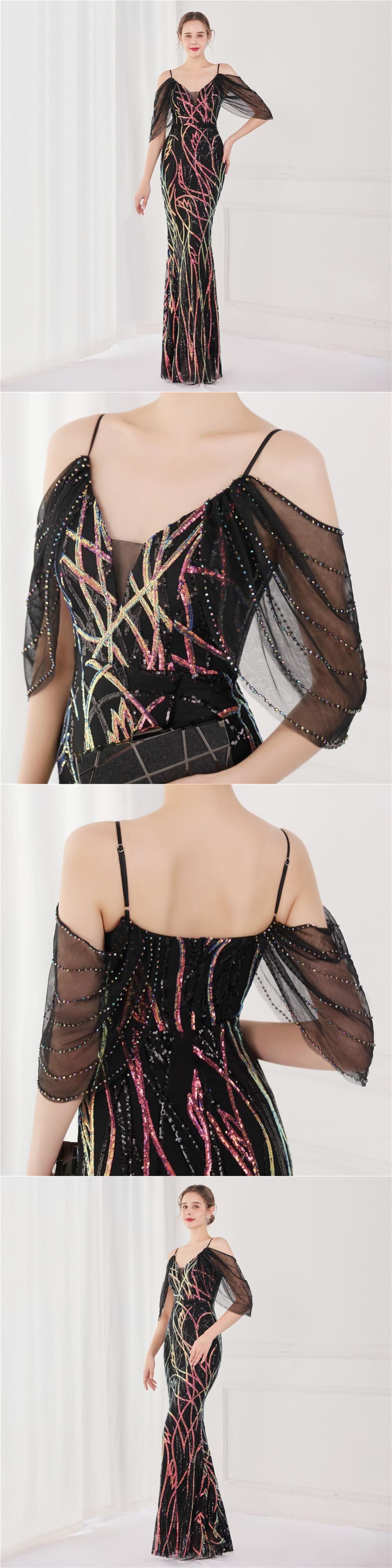 YIDINGZS 黒スパンコールドレスビーズイブニングドレス女性パーティーストラップマキシドレスロングウエディングドレス 19002 ブラック
