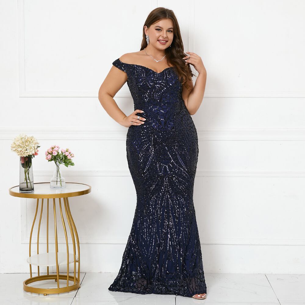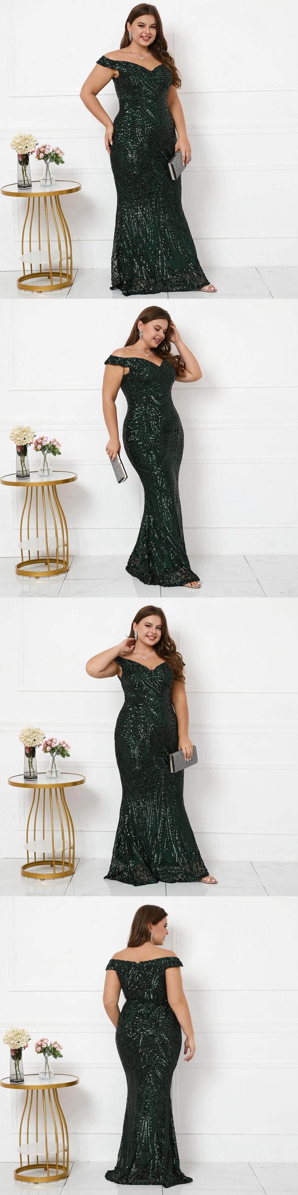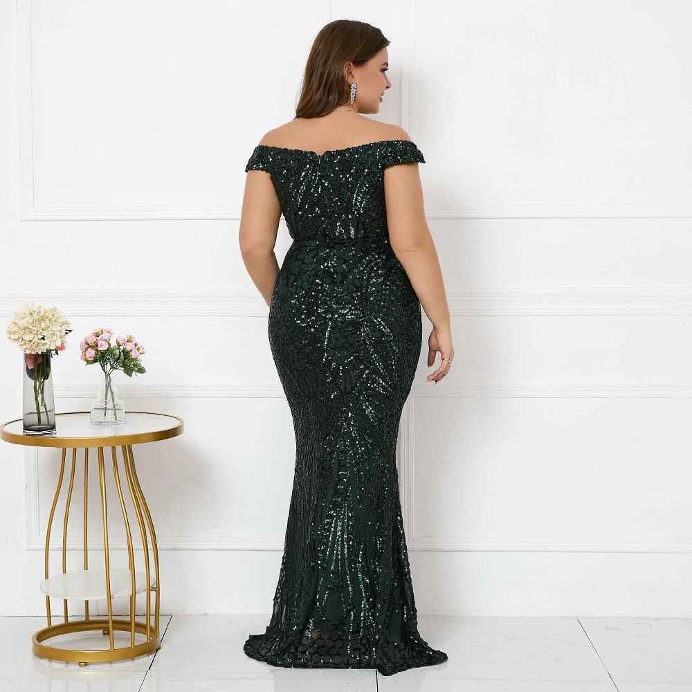 プラスサイズの女性オフショルダーグリーンスパンコールイブニングドレスボートネックパーティーマキシドレスロングウエディングドレス 大きめサイズ