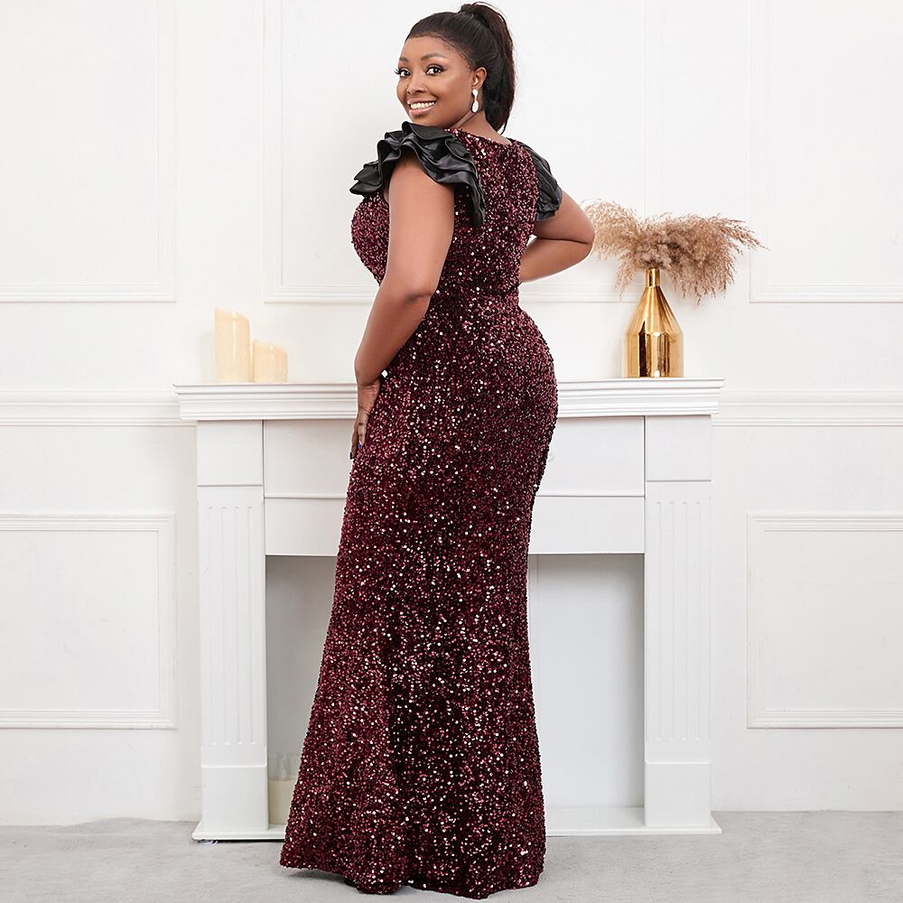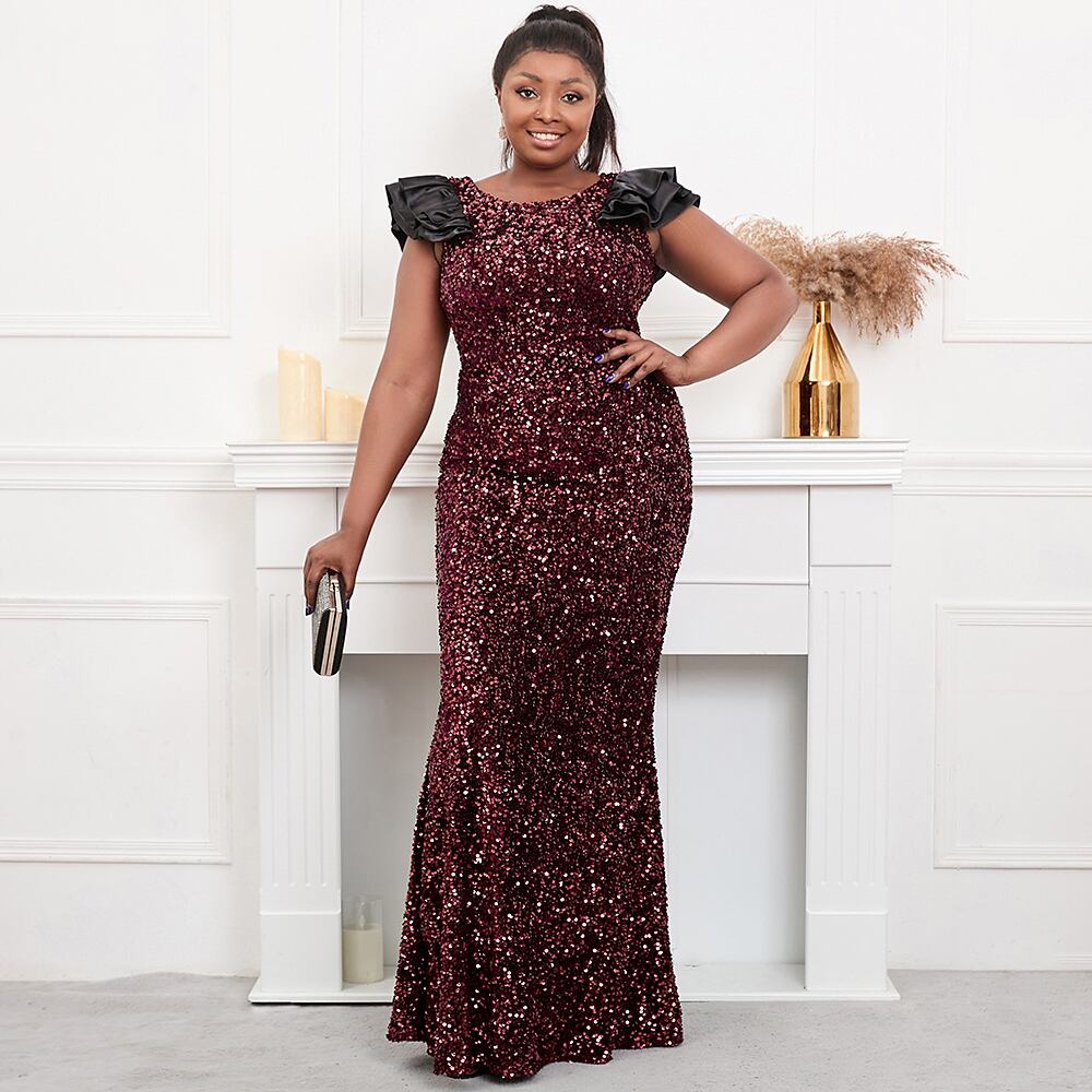 プラスのサイズの女性紫スパンコール パーティー マキシ ドレス バタフライ スリーブ イブニング ドレス ロング ウエディング ドレス 大きめサイズ パープル