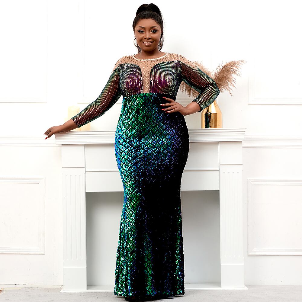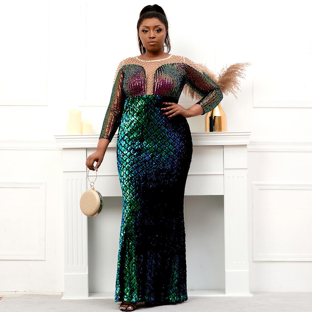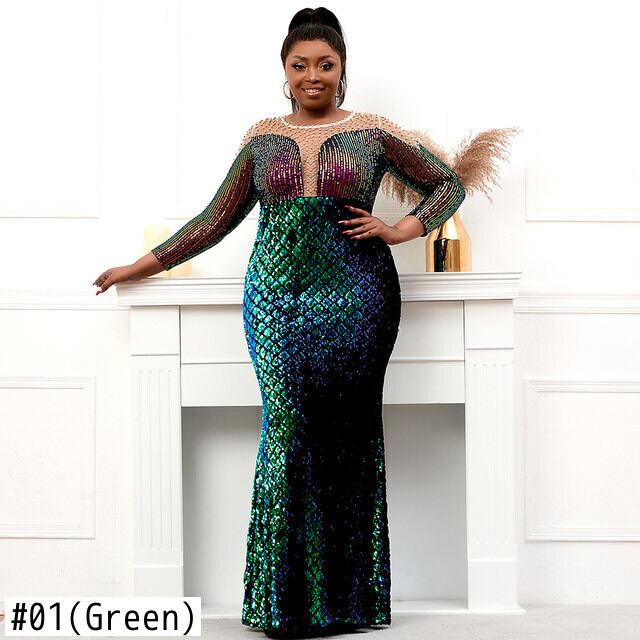 プラス サイズ ストレッチ グリーン スパンコール ドレス真珠フル スリーブ シースルー マーメイド イブニング ナイト ロング パーティー マキシ ドレス 大きめサイズ パール | transfom