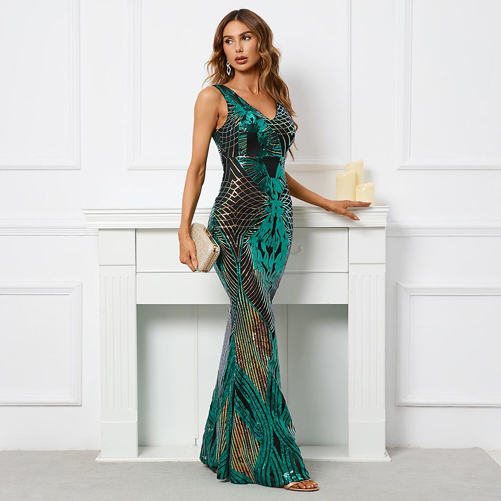 YIDINGZS セクシーな V ネック ストレッチ ドレス グリーン スパンコール イブニング ドレス ノースリーブ パーティー マキシ ドレス ロング ウエディング ドレス Vネック | transfom