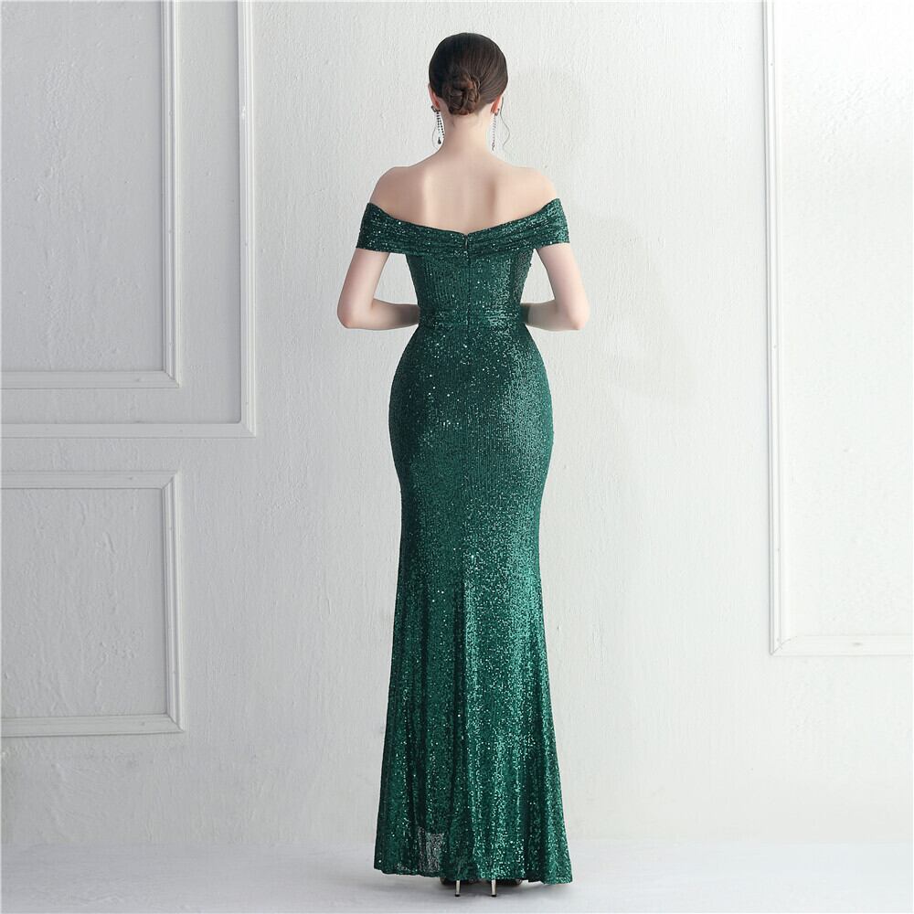 YIDINGZ スラッシュネックセクシースリットロングスパンコールイブニングドレス高級ノースリーブカクテルパーティーウエディングドレス