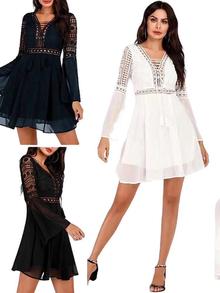 ショートパーティーシフォンドレスブラック長袖ソリッドカラーフリルパッチワークレースドレス ロング
